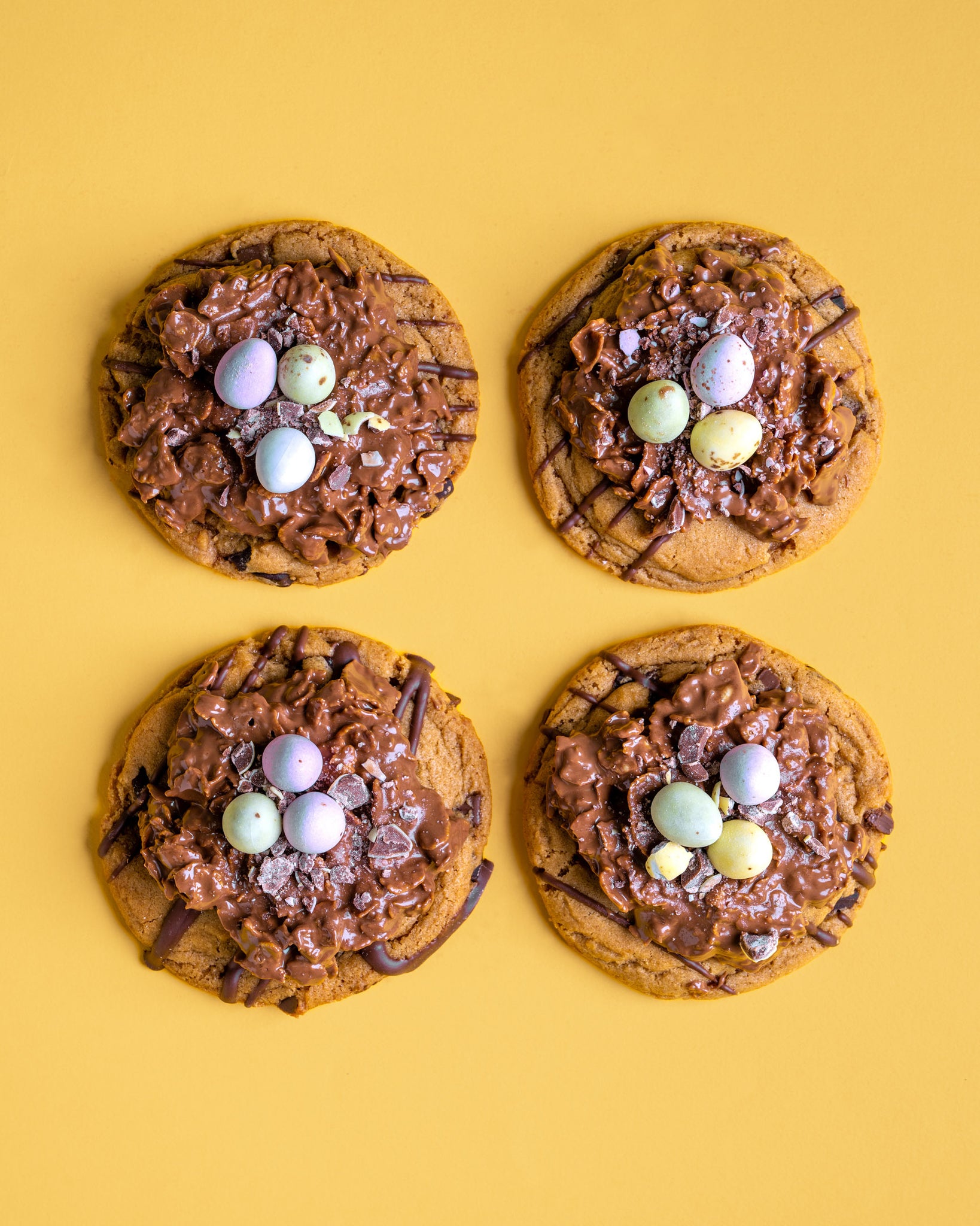 4 luscious chocolate chip cookies, topped with chocolate covered corn flakes and mini eggs.