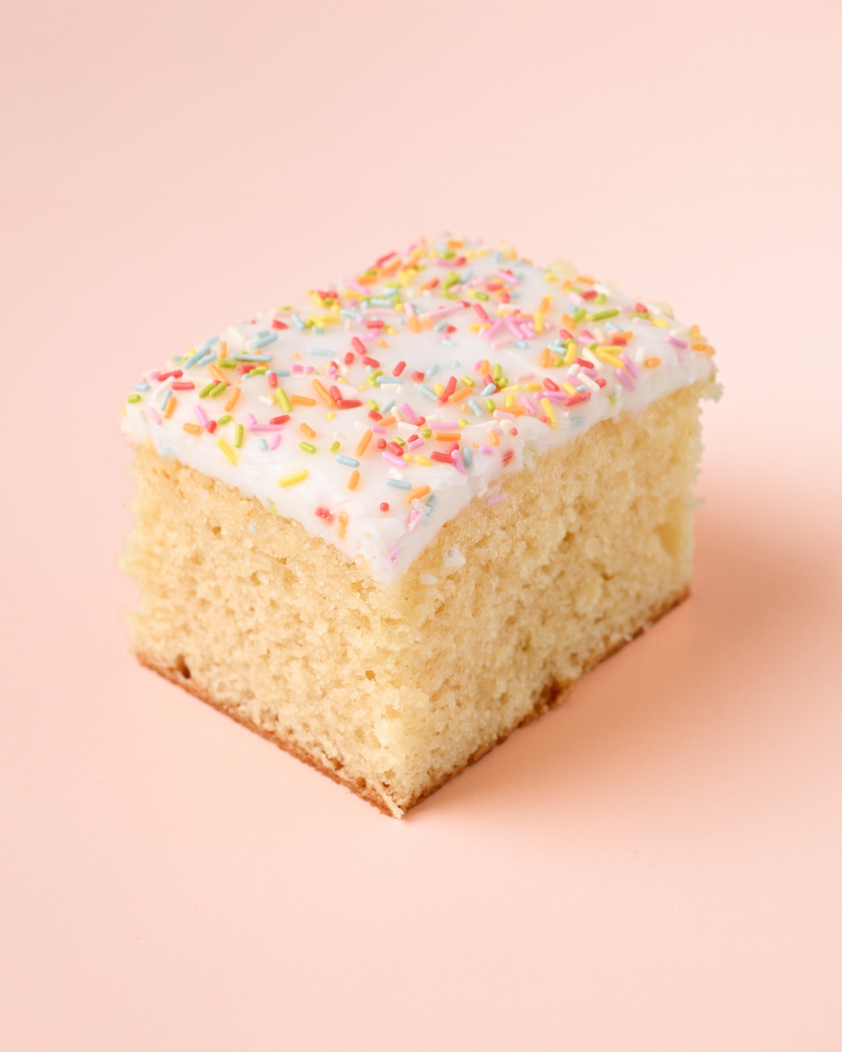 Fluffy vanilla cake topped with icing and sprinkles. Marked in 18 on top to make it easy to portion. Please cut through with a clean knife.
