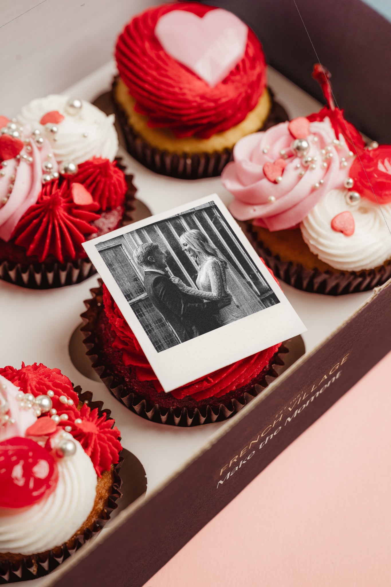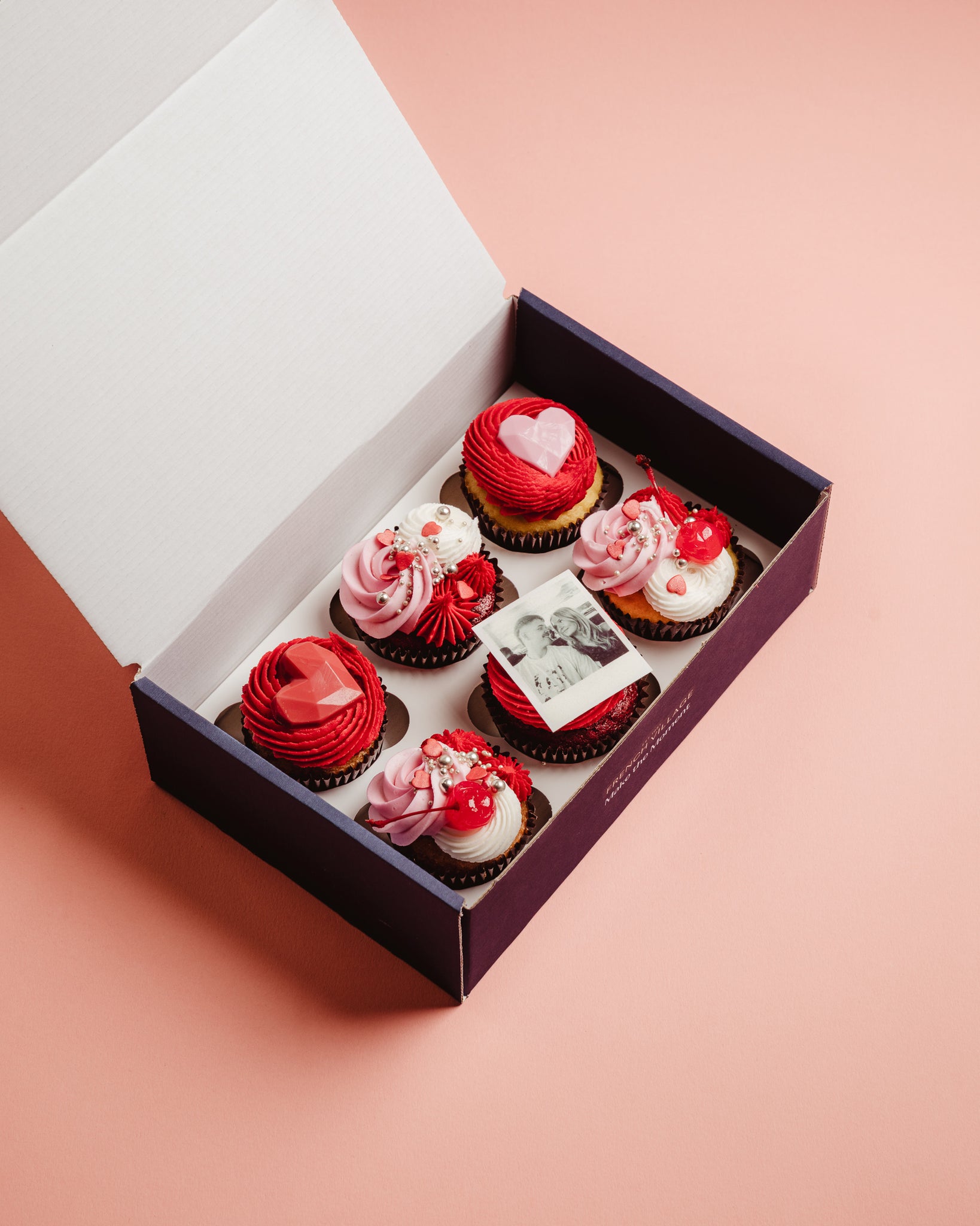 Spread the love with our Polaroid Cupcakes. A box of six delectable creations that capture romance in every bite. Simply add your favourite photo and we'll transform it into a charming edible Polaroid-style masterpiece.